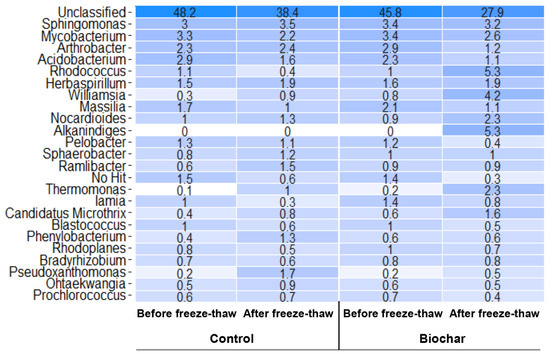 Heatmap of the genera with the highest percentage abundances in phytostabilized non-amended (control) and biochar-amended soil samples, respectively. Phytostabilization was carried out under the following conditions: (1) greenhouse temperatures (before freeze–thaw) and (2) greenhouse temperatures, followed by FT-chamber temperatures (after freeze–thaw).