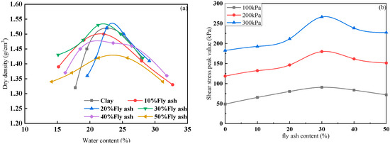 (a) Standard compaction curves and (b) Relation of shear stress peak value and fly ash content under different normal stress.