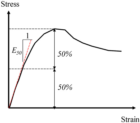 In this study, according to ASTM D4767-11 [43], the UU triaxial test was performed on all specimens following the specific procedures. In search of the shear strength of the fiber-reinforced FAS specimens, confining pressures of 200, 300, and 400 kPa were chosen [30]. Then, the application of a strain rate of 1.5 mm/min was carried out on specimens until the axial strain reached 20%. During testing, shear stress and the axial strain were recorded. The parameter (as shown in Figure 4), which was defined as the secant modulus corresponding to 50% strength of soils in the nonlinear stress–strain curve, was adopted to evaluate the stiffness of soils [44,45].