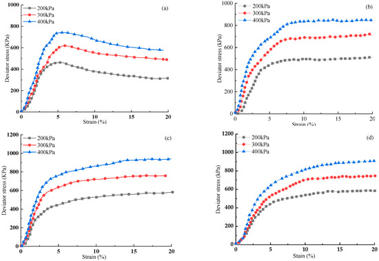 It is shown that all non-reinforced specimens exhibit strain-softening behavior in the stress–strain relationship when the confining pressure ranges from 200 to 400 kPa. For non-reinforced specimens, the deviatoric stress increases to the peak value when axial strain is around 5%. Afterward, there is a drop when the axial strain continuously increases. For reinforced specimens (i.e., Figure 5b–d), the curves had experienced a rapid growth stage in which deviator stress increased sharply before the axial strain reached 3%, and then a placid increment known as stable stage was present after 3%. The maximum deviatoric stress enlarges with the rise of confining pressure for reinforced fibers of the same size. In contrast, all fiber-reinforced FAS specimens demonstrate the performance of strain hardening. The deviator stress of fiber-reinforced FAS increments with the rise of axial strain. Under fiber reinforcement of the same size, the deviator stress in the stable phase increases along with the rise of confining pressure, as demonstrated in Figure 5b–d. Hence, compared to plain soil, the maximum deviator stress of the fiber-reinforced FAS specimens occurs when the axial strain reaches 20%. Meanwhile, under the same fiber size and axial strain, with the rise of confining pressure, the deviator stress increases significantly. However, the cured soil after fiber reinforcement changes from the original strain softening to strain hardening. After the rapid increase of 3% strain, the strength of the soil increases slowly and changes into a strain hardening model. The ability of the soil to resist shear stress also increased significantly, indicating that the additional fibers can considerably improve the shear resistance of FAS.