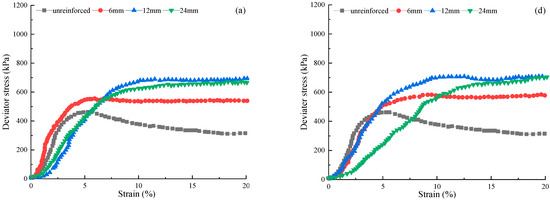 Figure 6 outlines the relationship between the deviator stress and the axial strain for the FAS mixtures with FC of 1%, 1.5%, and FL of 6 mm, 12 mm, and 24 mm. The curves of non-reinforced soil specimens are also provided as a comparison. For different fiber lengths, the results show that the shear stress of soil specimens increments with the size of strain, and the phenomenon of strain hardening becomes more and more prominent (from Figure 6a–c) with the rise of confining pressure. This may be because the FL 6 mm PP fibers are too short to form a more robust structure. The FAS specimens with FL 12 mm and 24 mm fibers depict a phenomenon that shear strength is not increased with the large fiber length in the end [37,46]. For example, under 200 kPa confining stress and FC 1%, the deviator stress increases from 539.6 to 689.4 kPa as the FL is elongated from 6 mm to 12 mm. When the FL increases from 12 mm to 24 mm, the deviator stress is reduced by 2.7%, and the value decreases from 689.4 to 670.6 kPa.