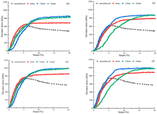 The relation of stress–strain curves of polypropylene (PP) fiber-reinforced FAS specimens: (a) FC = 1.0%, FL = 6 mm under 200 kPa, (b) FC = 1.0%, FL = 12 mm under 300 kPa, (c) FC = 1.0%, FL = 24 mm under 400 kPa, (d) FC = 1.5%, FL = 6 mm under 200 kPa, (e) FC = 1.5%, FL = 12 mm t under 300 kPa, (f) FC = 1.5%, FL = 24 mm under 400 kPa.