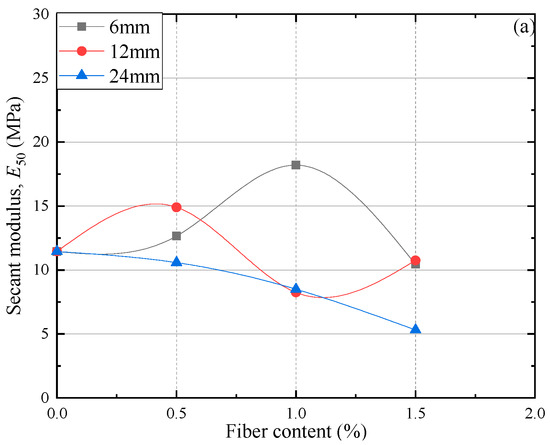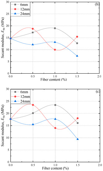 The modulus, , is an important parameter to describe the stiffness of materials [47]. The impact of the fiber length and proportion on the secant modulus is shown in Figure 7.