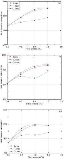 Figure 8 shows the peak deviatoric stress changes of reinforced FAS specimens with different fiber contents (0, 0.5%, 1%, and 1.5%) and different confining pressures (200 kPa, 300 kPa, and 400 kPa).