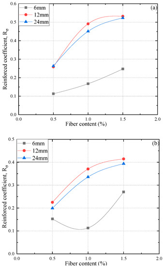 (3) The values of reinforcement coefficient for all reinforced FAS specimens developed an upward trend, indicating that the fiber can lead to a significant improvement of the shear strength. The reinforcement coefficient decreases when FC increases from 6 mm to 12 mm. Among all values, 12 mm in fiber length and 1.5% in the fiber content are the optimum options with the highest value of .