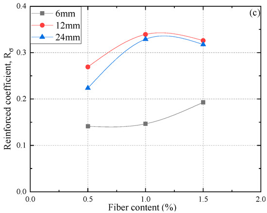 Relations between reinforced coefficient and different FC and fiber length: (a) under 200 kPa, (b) under 300 kPa, (c) under 400 kPa.