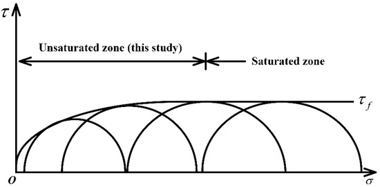 Under the unconsolidated undrained experiment condition, the effective stress circles of the saturated soil are overlapped with each other, which implies that the strength envelope of the total stress circle is a horizontal line (as shown in Figure 10) [46]. The UU triaxial test results of saturated soil are usually analyzed by the Mohr–Coulomb strength theory, and the intercept of the strength envelope on the vertical axis is the shear strength, termed . However, due to the saturation degree being less than 100% (unsaturated soil), and there is an error, the failure envelope of shear strength should not be horizontal. Thus, the internal friction angle is not 0.