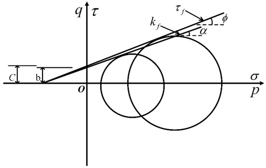 The line connecting ultimate stress domes under a variety of confined pressures is called the line, and the strength envelope is the line. The line is more convenient and accurate than the line to calculate shear strength parameters [50]. The relationship between the inclination α and intercept b of the line is related to the inclination and intercept of the strength envelope , as illustrated in Figure 11, and expressed as: