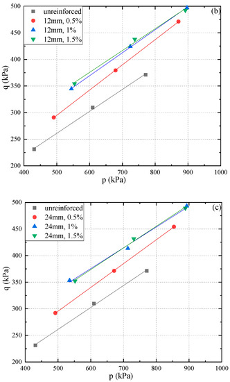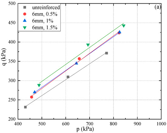 Two methods will be adopted to evaluate the shear strength parameters of soils (the cohesion and the total angle of shearing resistance ). Firstly, the common tangent of the Mohr circle under different confining pressures is obtained, and the strength parameters of soils are determined via the application of the strength envelope. The other method is to use the p-q diagram of soils to calculate soil strength parameters [38,49]. In this paper, the shear strength values of PP fiber-reinforced FAS specimens are determined by the p-q diagram method. Parameters of and are defined as: