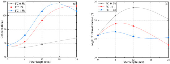 Correspondingly, Figure 13 plots the and of reinforced specimens with a variety of fiber lengths and fiber contents. It is observed that specimens with a particular fiber content have a significant increase in cohesion when fiber length increments from 0 mm to 12 mm. After that, the cohesion of FC 1.5% and FL 24 mm had a slight reduction. The maximum cohesion observed with FL 24 mm and FC 1% indicates that FC and FL considerably influence the cohesion of fiber-reinforced FAS specimens in the range of FC 1% and FL 12 mm; when exceeding the scope, a mild increase of the value could be verified.