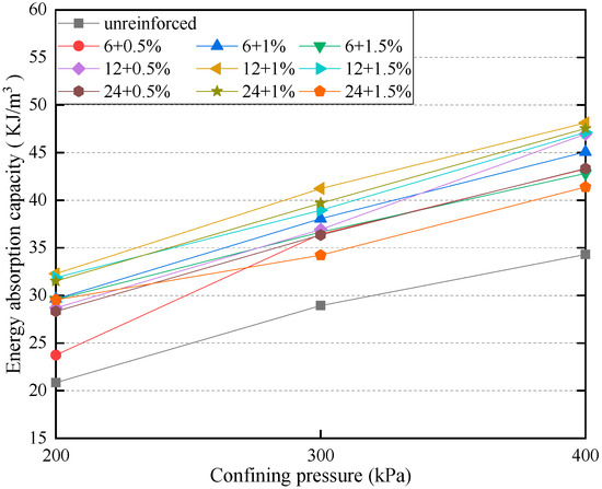 It should be noted that the energy absorption capacity refers to the total sum of energy required to deform specimens during experiments and represents the ductility of PP fiber-reinforced FAS mixture specimens, which can be obtained through the calculation of the area beneath the stress–strain curve of specimens [51]. The higher the energy absorption capacity, the more difficult it would be to deform specimens. Figure 14 shows the energy absorption for an axial strain of 20% in all specimens. As a result, it can be clearly determined that the energy absorption capacity of specimens will considerably rise with the inclusion of fiber. Additionally, the energy absorption capacity will gradually increase as the confining pressure increments. The energy absorption capacity of reinforced soil with additional fibers is better than that of plain soil. As can be seen from the figure, energy absorption increased from 13.9% to 42.1% as FC developed from 0.5% to 1% when FL 6 mm was added; however, a reduction of energy absorption happened when FC changed to 1.5%. From Figure 14, we can see that the fiber length also has a certain impact on the reinforcement effect. Among specimens under all values of confining pressures, it can be found that the utmost energy absorption capacity is yielded when the FL is 12 mm and FC is 1%. It may be clarified that the residual strength of soil specimens can be improved by the incorporation of fibers. Meanwhile, the elongation of fibers enables specimens to absorb higher energy at a given axial strain.