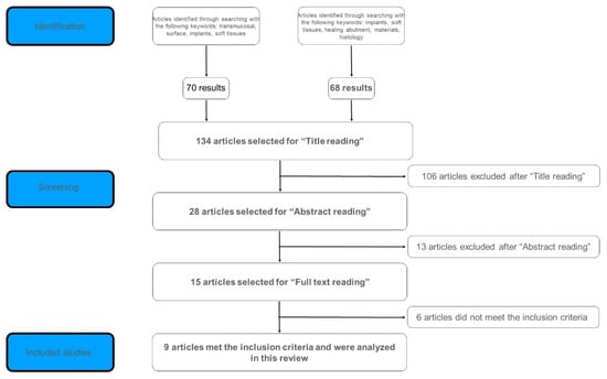 Reviewers of group 1 (C.C./V.M.) conducted the research using the following group of keywords: “transmucosal, surface, implants, soft tissues,” obtaining 70 results.