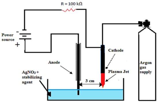 Various approaches have been used to produce AgNPs, including photochemical and chemical processes in reverse micelles [], radiation-assisted approaches [], chemical reduction in a solution of silver salts [], sonochemical processes [], electrochemical processes [], sol-gel synthesis [], and the microwave heating method []. The most common of the synthesis methods mentioned above are chemical methods [], but these approaches require the introduction of harmful and toxic chemical reducing agents during experiments, which lead to environmental pollution. Plasma reduction is a process in which plasma produces ions, electrons, metastables, charged species, oxidizing species, H2O2, atomic oxygen, O3, OH radical, and UV-radiations, which reduce the metal salts along with stabilizing agents to produce AgNPs of specific sizes []. This synthesis technique is eco-friendly and easy to perform compared to other known techniques. Plasma treatment is conducted at atmospheric pressure and room temperature, making it a potentially facile method for the large-scale production of AgNPs.