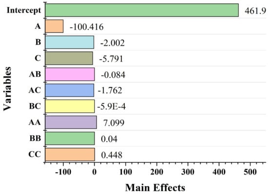 The BBD approach was used to determine the possible average size of metal nanoparticles (MNPs) affected by selected process parameters, including concentration of stabilizing agent, metal salt concentration, and time of the reaction mixture. The RSM approach was adopted for the optimization of an average size for the prepared AgNPs calculated by the regression equation. Overall, 15 sets of trials were created by BBD (Table 1) using three process parameters at three different levels. To examine the effect of these parameters, the experimental results were statistically analyzed using ANOVA (analysis of variance). The results of ANOVA analysis are shown in Figure 2 in the form of a Pareto chart. Each bar length in the Pareto chart indicates the significant influence of a respective factor and its effects on the considered response (Y = size of AgNPs), as indicated by F-values in Table 2. The model F-value (16.039) in Figure 2 confirms the significance of the ANOVA analysis model. The parameters with a p-value less than 0.05 were observed to impact the response substantially. The model was deemed statistically valid because the p-value did not exceed 0.002. The adjusted-R2 value (0.7750) was also significant, indicating the validity of the adopted model. But the resulting R2 value (0.9016) revealed the 90.16% contribution of independent variables in the total variation in the average diameter of NPs []. In terms of statistic design, our objectives were to identify the maximum significant interactions between process parameters to generate small-sized AgNPs of optimum uniformity and stability. It was based on the analysis of the normal residual graphs for each of the response variables shown in Figure 3.The fitness of the model was checked by calculating the coefficient of determination (R2). A correlation coefficient R2 ~ 1 value indicates a strong synergistic effect []. The observed and predicted R2-values of 0.96646 show that the response has (96.64%) variability. As a result, the current R2 value shows that the predicted and actual responses are aligned well, implying that the model is dependable in the present research. Multiple regression analysis was used to determine all of the model coefficient values of the quadratic model. The p-value and Student t-test suggested a satisfactory quality in terms of statistical analysis (Table 3). The linear impacts of reaction salt concentration (B) and reaction time (C) showed a negative impact on the size of AgNPs, whereas the stabilizing agent concentration (A) revealed a positive impact. The importance of each of the coefficients was assessed by the p-value, which was found to be significant in the context of understanding the pattern of reciprocal interaction between process variables. The lesser the p-value, the more significant the correlated coefficient. Among all the linear effects, the linear term of AgNO3 (A) had the most significant negative influence on nanoparticle size according to the degree of significance. The quadratic terms for AgNO3 (A2), the concentration of the stabilizing agent (B2), and reaction time (C2), on the other hand, all showed a considerable positive influence, indicating that they may be treated as limiting factors, with slight fluctuations in their values affecting the size of AgNPs. In line with this, the Pareto charts revealed that only the interaction between the stabilizing agent concentration (A) and reaction time (C) had a significant negative effect. To forecast the particle size in the experimental runs, a 2nd order polynomial model was fitted to the results of the experiments using the Minitab software. This model develops an empirical link between the response variable and the three independent factors, as in Equation (3):