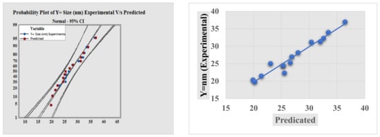 Normal and probability plot for experimental vs. predicted size of AgNPs.