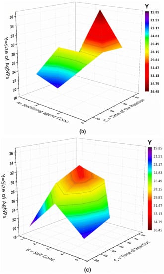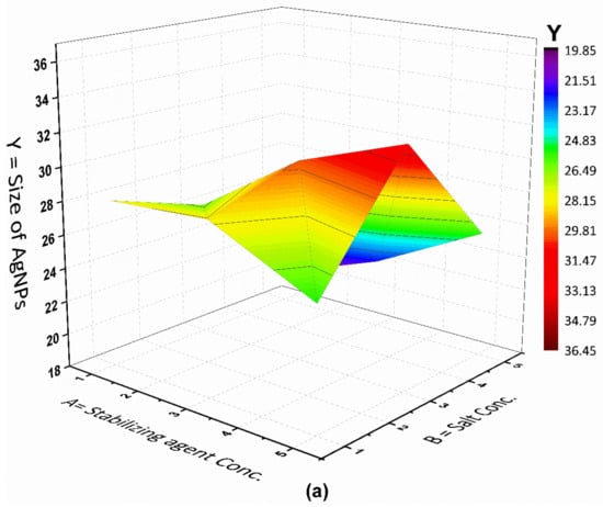 The statistical optimization of the plasma reduction process for AgNPs was achieved using the response surface methodology (RSM), in which one or more independent variables were involved. RSM provides a greater amount of information with a reduction in the number of experimental trials, chemical doses, time, and total research costs. The interactions between the variables that could impact the production of AgNPs was evaluated using a RSM-based Box–Behnken design []. The combined effect of three independently varying variables, namely, the concentration of the stabilizing agent (A), the metal salt (AgNO3) concentration (B) and time of the reaction (C), were taken to reveal the statistical analysis for the process at three different levels (−1, 0, +1), which comprised 15 trials. Their findings were fitted into a 2nd order polynomial model. This model was a mathematical relation employed to utilized to obtain the results and approximate the real answer by determining the linear, quadratic, and cross effects of the investigated independent variables, as shown in Equation (1):