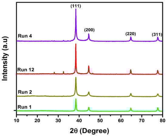 XRD spectra of statistical analyzed AgNPs (runs 1, 2, 12 and 4).