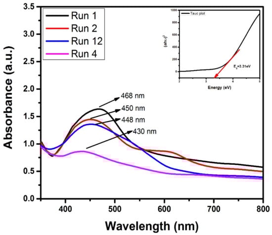 Since the valence and conduction bands of AgNPs are close to each other, electrons can easily move between them. Figure 6 shows the absorption spectra of AgNPs with different process parameters (mentioned in Table 1). The particle size and physio-chemical characteristics have a significant impact on the absorption spectra. The sample exhibited surface plasmon resonance (SPR) characteristics. AgNPs with particle sizes ranging from 5 to 25 nm displayed a narrow band, with the highest absorbance, 468 nm. Thus, the absorption spectra were found to be strongly dependent on dipole oscillation []. The literature reveals that the SPR peak shifts to a shorter wavelength when the size decreases. It has also been observed that when the sample size decreases, the absorption spectra weaken and become broader []. This plasma reduction process results in the optimized production of AgNPs with a diameter of 19.89 nanometers. Furthermore, the absorption spectra of the AgNP samples denoted by runs 1, 2, 12, and 4 in Figure 6 show a maximum absorption peak at 468 nm.