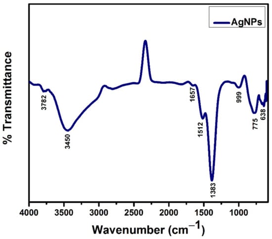 The FTIR spectroscopy of optimized AgNPs (run 4) was used to analyze their purity and associated functional groups, as illustrated in Figure 10. The FTIR of AgNPs indicates eight representative peaks at 638 cm−1, 775 cm−1, 999 cm−1, 1383 cm−1, 1512 cm−1, 1657 cm−1, 3450 cm−1, and 3782 cm−1. It has been observed that noble metal ions (Ag+) speed up the oxidation process and reduce themselves into silver atoms. The natural sugar in glucose also serves as a surface coating for synthesized NPs. A glucose stabilizer, which is also considered a small molecule, is an eco-friendly and porous stabilizer that allows small molecules to be diffused. When it is attached to the surface of nanoparticles, it is easily removed during the plasma reduction process. As a result, the plasma reduction process produces NPs that are more biocompatible and purer. During the synthesis process, silver ions may interact with the binding sites of bioactive chemicals existing in the glucose. The shift in the position of a peak at the 1383 cm−1 band indicates the presence of the S–O group.