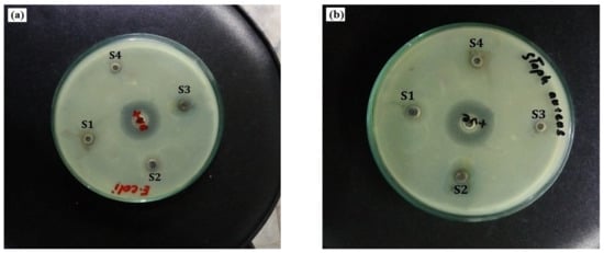 A positively charged silver ion may form an electrostatic attraction with a negatively charged microbial membrane. Table 5 shows the zone inhibition results for samples S1 (run 1), S2 (run 2), S3 (run 12), and S4 (run 4). The inhibition zones of AgNPs for different metal salt concentrations were measured to be approximately 5 mm, 6 mm, 9 mm, and 12 mm when the E. coli strain was used. This was also expressed as AgNP size < followed by a zone of inhibition. Similarly, the inhibition zones of AgNPs against S. aureus were measured to be approximately 8 mm, 10 mm, 12 mm, and 18 mm, with varying concentrations of stabilizing agents and metal salts. Figure 11a,b indicate the bactericidal effect of the resulting AgNPs towards S. aureus and E. coli depending on the different process variables. It would appear that at a 5 mM metal salt concentration and 3 mM of stabilizing agent, the number of formed nanoparticles was greater and the agglomeration of the formed AgNPs was limited due to the concentration of the metal salt and the high concentration of natural stabilizers such as saccharides, carbohydrates, and proteins that were present in the synthesis of the AgNPs. As a result of this condition, optimized NPs exhibit smaller particle sizes and higher surface area to volume ratios, which results in more of the produced NPs becoming attached to the cell membrane, induced cell death, and an altered permeability. Smaller-sized NPs can easily infiltrate microorganisms and disrupt their function by attaching to nucleic acid and linking to the functional areas of specific enzymes [].