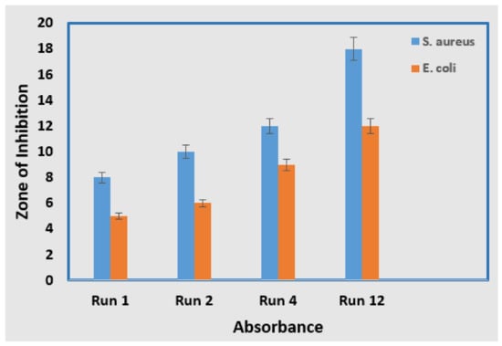 A disc diffusion test was performed to measure an antibacterial assay for AgNPs produced under optimized conditions. The antibacterial activity was measured by using E. coli (Gram-negative) and S. aureus (Gram-positive) strains. In total, 10 of AgNPs (runs 1, 2, 4, and 12) in a concentration of 150 were loaded in each disc. An analysis of the inhibition zone was carried out at 37 °C for 24 h of incubation. As a result, the zone of inhibition was calculated in millimeters.