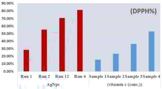 The AgNPs of statistical runs 1, 2, 4, and 12 showed a good ability to scavenge stable radicals. The antioxidant activity of these nanoparticles was tested using the 1,1-diphenyl-2-picrylhydrazyl (DPPH) radical. Using the stable radical DPPH, the free radical scavenging activity of AgNPs and conventional vitamin C was investigated. A total of 1 mL of varied AgNPs solutions (runs 1, 2, 4, and 12) were vortexed extensively with 1 mL of newly made DPPH (1 mM in methanol) solution. This was then incubated for half an hour before an absorbance test was performed a fixed wavelength of 517 nm. The results were expressed in the form of the percentage inhibition of the DPPH radical. The control was DPPH (all reagents except the sample) and the blank solution was methanol. The inhibition percentage (% DPPH) was obtained to express the free radical scavenging activity using Equation (2) []: