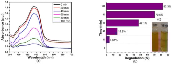 The photocatalytic activity of the size-optimized AgNPs (run 4) was tested by the degradation of methyl orange (MO) solution under sunlight irradiation. Furthermore, the degradation of the dye was monitored by a UV–Vis Spectrophotometer. As can be seen in Figure 14a, in the presence of 0.1 g of an AgNP photocatalyst, the intensity of the peaks at 465 nm gradually decreases and disappears within 100 min for 5 ppm of MO dye. Figure 14b,c show that 82.3% degradation of MO was achieved under sunlight illumination, and the dye degradation was identified by a change in color in an aqueous solution. The results revealed that the optimized AgNPs effectively degraded MO dye (82.3%) after 100 min of degradation. The dye degradation efficiency of the AgNPs increased with an increase in time intervals and was calculated according to the following formula in Equation (6) [,]: