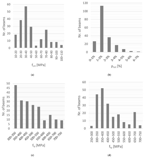 Figure 1 shows that 142 and 60 beams are built with normal- (up to 50 MPa) and high-strength concrete (over 50 MPa, according to [5]), respectively. The average concrete compressive strength ranges between 14 MPa and 110 MPa. The total reinforcement ratio ranges between a minimum of 0.37% and a maximum of 6.36%, being for most of the beams in the range of 1 to 2%. The yielding stress ranges between 308.8 MPa and 723.9 MPa for the longitudinal reinforcement and between 285 MPa and 714.8 MPa for the transverse reinforcement. For most of the beams, it ranges between 300 MPa and 500 MPa.