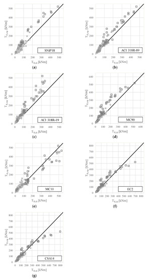 Experimental vs. theoretical torsional strengths (design codes). (a) SNiP18. (b) ACI 318R_89. (c) ACI 318R_19. (d) MC90. (e) MC10. (f) EC2. (g) CSA14.