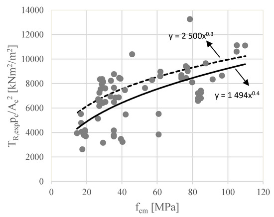 Following the same methodology from Rahal [8] to refine the upper limit stated in Equation (3) to control concrete crushing, a subset of 70 beams (62 plain beams and 8 hollow beams) was created from the database. The failure of such beams was governed by concrete crushing in the struts without yielding the torsional reinforcement. These beams are marked with an asterisk in Table A3 and represent beams with fragile failure. For these beams, a scatter plot is presented in Figure 4, with the average concrete compressive strength () in abscissa and the factor in ordinate (with the following units: [kNm], [m], and [m2]). From the scatterplot, a power trendline was computed to fit the data (). In the same graph, the power trendline computed by Rahal [8] and based on less reference beams is also plotted for comparison (, see upper limit stated in Equation (3)). This power trendline is slightly shifted up when compared to the power trendline computed from the scatter plot in Figure 4. After computing, the torsional strengths for the over-reinforced beams from the database using an equation based on and after a comparative analysis with the experimental strengths, it was observed that more unsafe values were obtained for the reference beams (the predicted torsional strength is higher than the real one for more beams, i.e., more points are located above the trend curve). This observation can be explained due to the high dispersion observed for the points in the scatter plot in Figure 4. For practical design, this situation is not acceptable and a correction of the power trendline was studied. The results suggested that the power trendline should be slightly shifted up to minimize the referred unsafe predictions. After some attempts, it was concluded that the power trendline suggested by Rahal [8] was quite appropriate. For this reason, the power trendline was also adopted in this study and the upper limit stated in Equation (3) remained unchanged to define the upper limit to control concrete crushing (see upper limit stated in Equation (7)).
