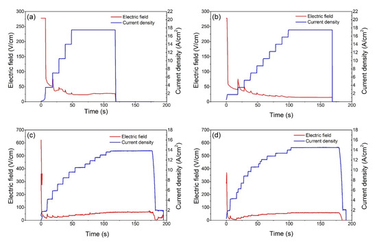 Electric field and current density change during (a) 0.1Li DC, (b) 0.3Li DC, (c) 0.1Li AC, and (d) 0.3Li AC flash sintering.