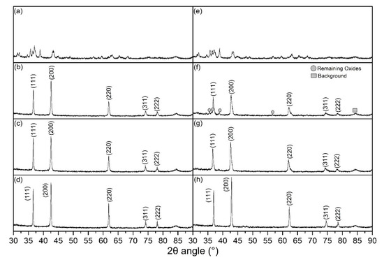 XRD spectra of ceramic samples sintered under different conditions: (a) 0.1Li green bodies; (b) 0.1Li, DC, 0.8 A; (c) 0.1Li, DC, 1 A; (d) 0.1Li, AC, 0.8 A; (e) 0.3Li green bodies; (f) 0.3Li, DC, 0.8 A; (g) 0.3Li, DC, 1 A; and (h) 0.3Li, AC, 0.8 A.