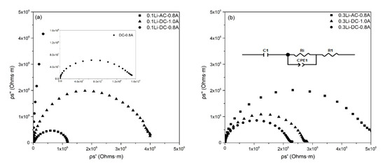 The room-temperature impedance spectra of the ceramic samples sintered under different conditions are presented in Figure 5. The electronic conductivity of (Mg, Co, Ni, Cu, Zn)1−xLixO is lower than 5 × 10−9 S/cm and can thus be ignored [21]. The equivalent circuit used to estimate the ionic conductivity of the samples is shown in the inset in Figure 5b. Ri represents the ionic resistance of (Mg, Co, Ni, Cu, Zn)1−xLixO, CPE1 originates from charge gradients, R1 is the contact resistance between electrodes and sintered (Mg, Co, Ni, Cu, Zn)1−xLixO, and C1 represents the blocking of ions on the surfaces between sintered ceramics and electrodes. According to the fitting result (Ri) of the equivalent circuit, the conductivity of sintered (Mg, Co, Ni, Cu, Zn)1−xLixO was calculated by Formula (1):