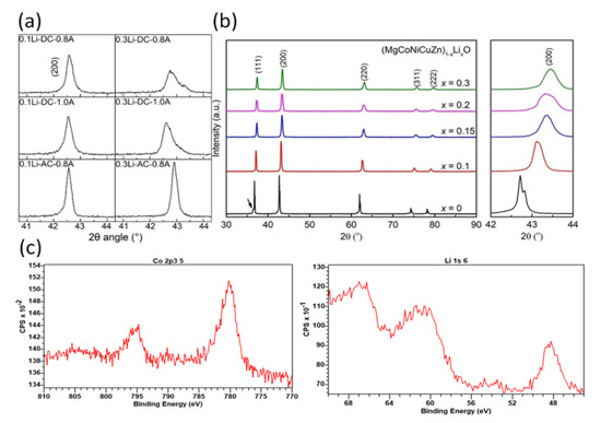 To explain the low ionic conductivity, more tests are conducted. According to other studies, doping Li into (Mg, Co, Ni, Cu, Zn)O will lead to shrinkage, making the (200) peak shift to a higher angle, as shown in Figure 6b [26]. A larger content of Li can induce larger displacement of the (200) peak position. The (200) peak positions in our experiment are shown in Figure 6a. It is obvious that in our study, the peak position displacement for the same content of Li was much smaller compared with that in other research. The (200) peak positions exceeded 43° when Li reached 10 mol.%, as shown in Figure 6b, while all the (200) peak positions were less than 43° in our research, even if the Li content was more than 30 mol.%. So, the lattice shrinkage of our sintered (Mg, Co, Ni, Cu, Zn)1−xLixO is much less than that reported in other research. Figure 6c demonstrates the XPS spectra of the flash-sintered samples. The characteristic satellite peak of Co3+ at 789 eV was not observed in any sintered ceramics, proving that all of Co is two valences. Thus, there was no Co3+ in our sintered samples compensating for Li+. Meanwhile, XPS analysis of the samples confirmed the existence of Li+ and the oxygen ratio reached 41.1%, indicating that oxygen participated in the reaction. Therefore, the low ionic conductivity of our sintered (Mg, Co, Ni, Cu, Zn)1−xLixO is mainly due to the oxygen at the positive pole eliminating the oxygen vacancies introduced. Most of Li is located in the halite structure of sintered samples.