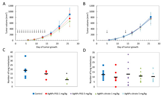 Tumor volume and the number of lung metastases in mice treated intragastrically (A,C) or intravenously (B,D) with citrate- or PEG-coated AgNPs. In A and B, data are presented as the mean ± standard deviation and arrows indicate the day of AgNPs administration. In C and D, the black rectangle represents the mean and the markers represent data from individual mice. * p < 0.05, n = 6.