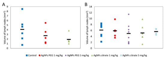 The summed volume of axillary and inguinal lymph nodes located on the same side of the body as the tumor in mice treated intragastrically (A) or intravenously (B) with citrate- or PEG-coated AgNPs. The black rectangle represents the mean and the markers represent data from individual mice. The differences are not statistically significant, n = 6.