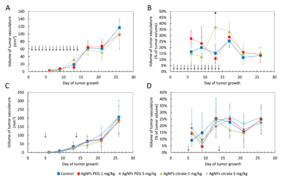 The volume of blood vessels in tumor tissue shown as an absolute value or as a percent of tumor volume in mice treated intragastrically (A,B) or intravenously (C,D) with citrate- and PEG-coated AgNPs. Arrows indicate AgNPs administration. Data are presented as the mean ± standard deviation, n = 6. * p < 0.05.
