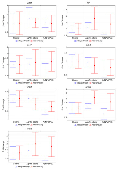 Expression of EMT-related genes at the mRNA level in tumors from mice treated intragastrically or intravenously with 1 mg/kg citrate- or PEG-coated AgNPs. Markers represent mean fold change values and whiskers represent the minimum and maximum fold change calculated from a standard deviation of ΔCt values. * p < 0.05 difference versus control group, n = 6.