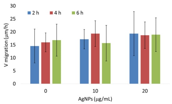 The 4T1 cells were seeded into 24-well plates (2.5 × 105 cells/well) to grow in a monolayer for 24 h. Cells were incubated with AgNPs for two, four, or six hours and then cell culture medium containing nanoparticles was removed, and cells were washed three times with PBS. The cells were scratched with a pipette tip to generate two scratch wounds per well. The detached cells were removed by washing three times with PBS. Afterward, 1 mL of fresh cell culture medium was added to each well. Incubation and imaging were performed for 12 h using a motorized Nikon Eclipse Ti microscope (Nikon, Tokyo, Japan) equipped with a controlled environment chamber (Okolab, Pozzuoli, NA, Italy). The images of 2–3 fields within each well were captured automatically every one or two hours. The experiments were repeated three times. The cell migration rate (Vmigration) was calculated as described by Jonkman et al. [28]. Briefly, the gap area at each time point was determined using Image J software [29] and plotted against migration time. The slope of the resulting curve was used to calculate the cell migration rate from the following equation: