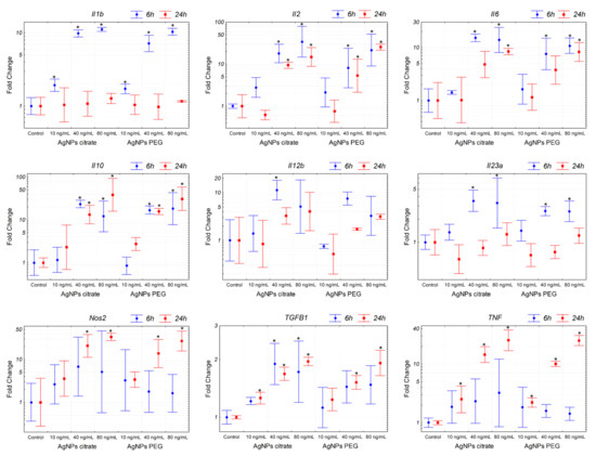 Expression of genes related to inflammation in 4T1 cells treated in vitro with citrate- or PEG-coated AgNPs for 6 or 24 h. Markers represent mean fold change values and whiskers represent the minimum and maximum fold change calculated from a standard deviation of ΔCt values. * p < 0.05 difference versus control group, n = 3.