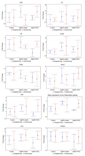 Expression of inflammation-related genes in tumor tissue from mice treated intragastrically or intravenously with 1 mg/kg citrate- or PEG-coated AgNPs. Markers represent mean fold change values and whiskers represent the minimum and maximum fold change calculated from a standard deviation of ΔCt values. * p < 0.05 difference versus control group, n = 6.