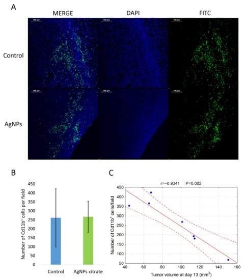(A) Representative images of Cd11b+ cells localization in tumor tissue from control and citrate-AgNPs-treated mice. Cell nuclei were stained with DAPI and Cd11b+ cells were stained with FITC-conjugated antibody. (B) Mean number ± standard deviation of Cd11b+ cells per field in tumor tissue from four control mice and three AgNPs-treated mice. (C) Correlation between the number of Cd11b+ cells and tumor volume on day 13 of tumor growth.