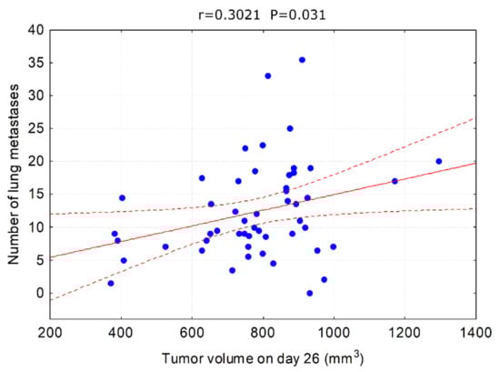 One can argue that the observed inhibition of metastasis formation is due to slower (although not in terms of statistical significance) tumor growth and hence delayed start of the metastasis process. However, correlations between tumor size and metastases can be misleading as metastatic spreading is not the exclusive hallmark of the late tumor development but the invasive cells can appear at the very beginning of the cancerous transformation to form distant lesions. If the tumor growth rate was the main factor influencing the formation of metastases, then we should observe a strong correlation between tumor volume and the number of metastases. This was not the case in our experimental model. A statistically significant correlation between tumor volume and the number of metastases was observed only on day 26 and it was weak (Figure 9), suggesting that other mechanisms were involved.