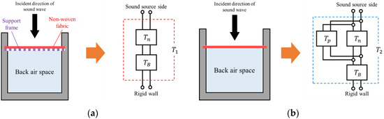 For the nonwoven fabric with a support frame in Figure 5a, the transfer matrix T1 can be obtained via the cascade connecting the transfer matrix Tn using the Miki model in Equation (6) and the transfer matrix TB for the back air space in Equation (13), as follows: