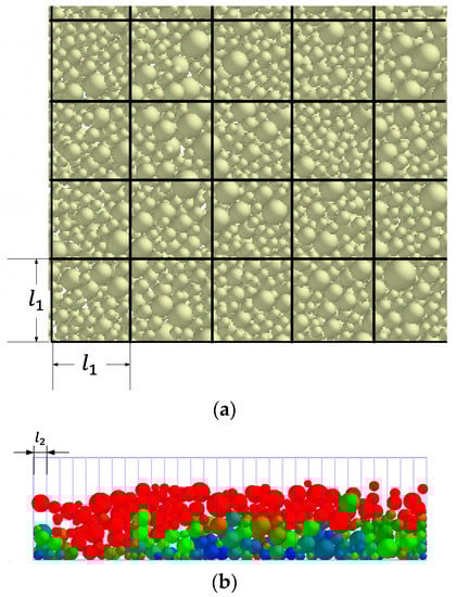 A schematic diagram of the area meshing used to measure the apparent density is shown in Figure 2. The density of the powder layer in the formation area is characterized by the ratio of the total particle mass to the particle volume of the layer: