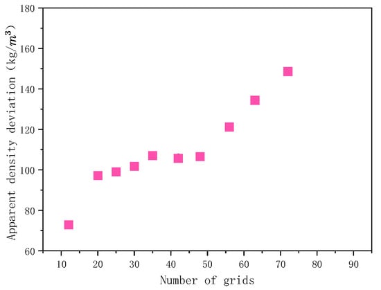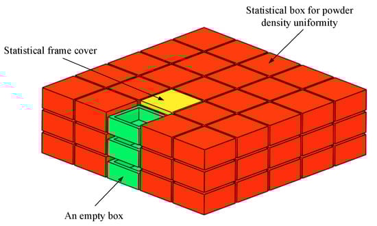 The standard deviation of the apparent density of the powder layer in the formation region is denoted by , which can be used to represent the density uniformity of the powder layer. The standard deviation S of the apparent density of the powder layer can be expressed as:
