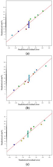 Normal residual diagram of powder quality from DEM simulation: (a) normal residual diagram of apparent density; (b) normal residuals of standard deviation of the density; (c) normal residual diagram of powder surface roughness.