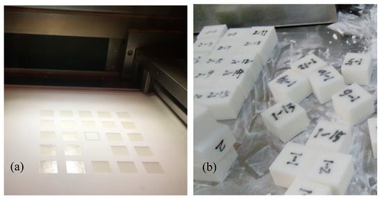 Statistical sintering experiment: (a) SLS molding process for the statistical box; (b) powder cleaning of sintered parts in the statistics box.