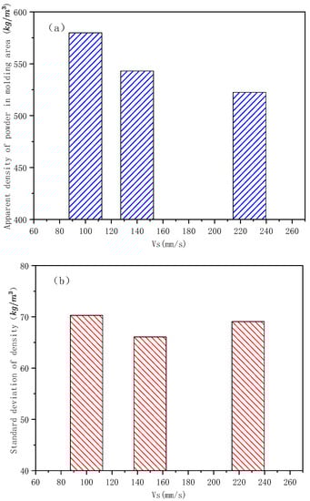 Experimental results of the powder spreading quality in the formation area (Vr/Vs = 0.5, Rg = 20 mm, D50 = 50 μm): (a) effect of Vs on the apparent density of powder in the formation zone; (b) effect of Vs on the standard deviation of the formation zone density.