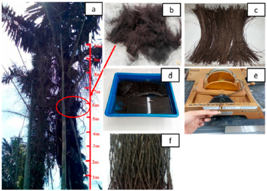 Preparation of SPF from sugar palm tree: (a) locating suitable SPF at the trunk, (b) SPF bundle, (c) combed SPF, (d) SPF treatment by alkalisation, (e) fibre yarning, and (f) finalised SPF yarn. Adapted with permission from Ref. [71]. Copyright Elsevier.